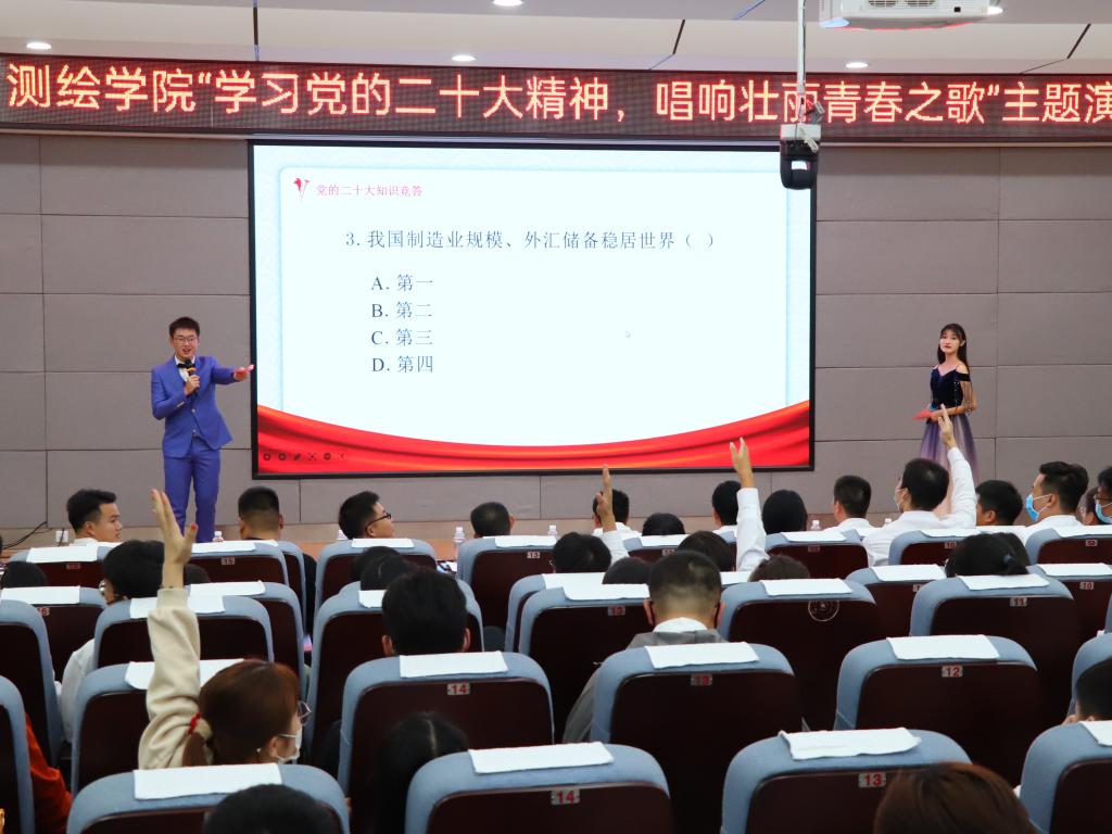 为学习宣传贯彻党的二十大精神,10月28日晚,测绘地理信息学院、信息科学与工程学院在01501报告厅联合举办了“学习党的二十大精神,唱响壮丽青春之歌”主题演讲比赛。两院党委主要负责人、党支部书记、部分二级学院专职组织员出席活动,两院学生党员、积极分子代表240余人观看了本次比赛。