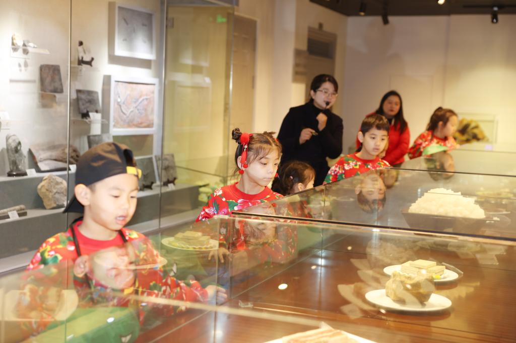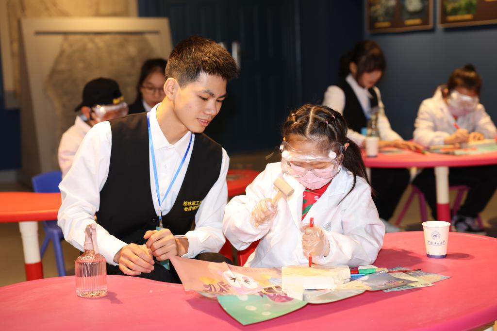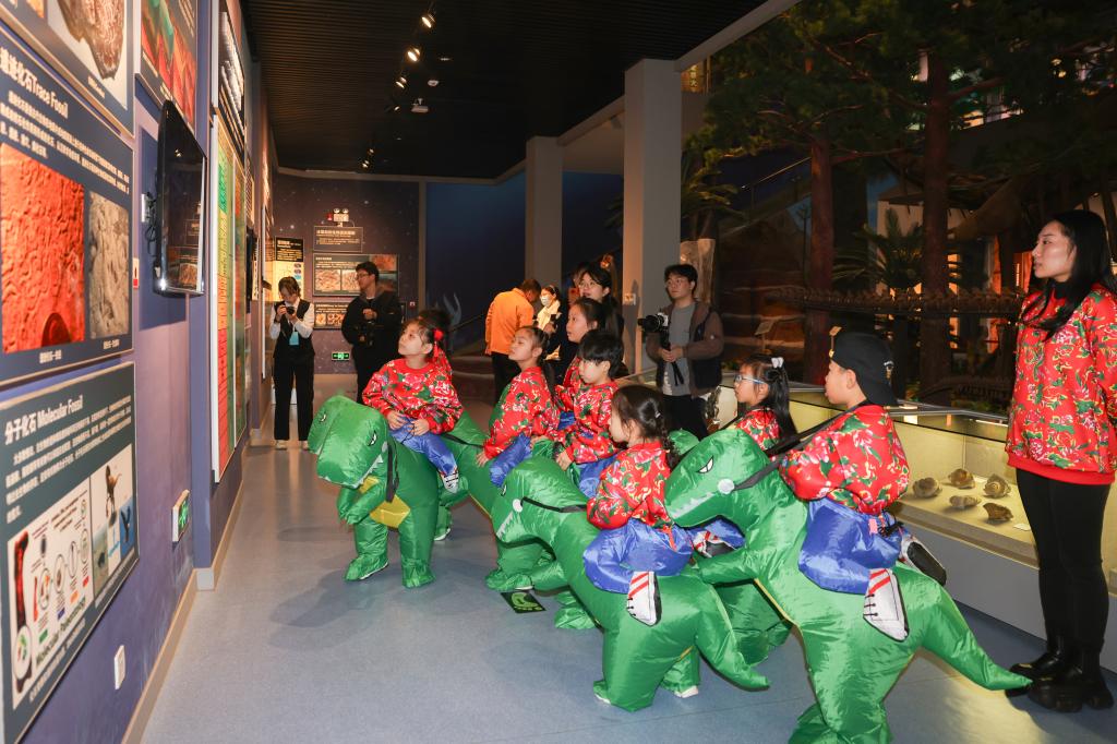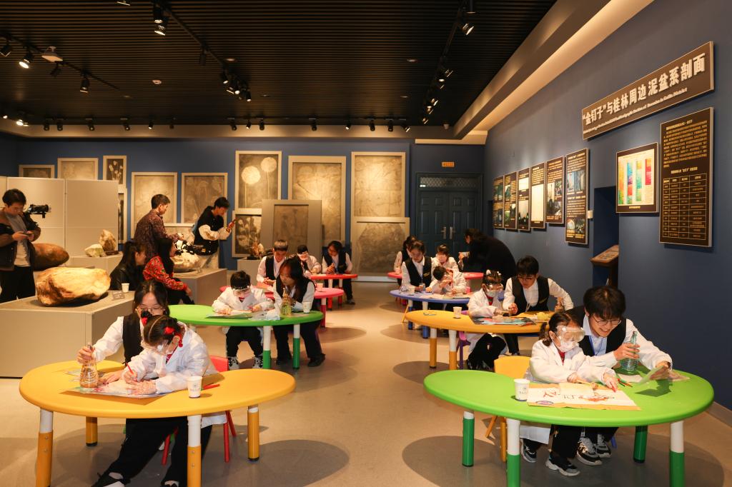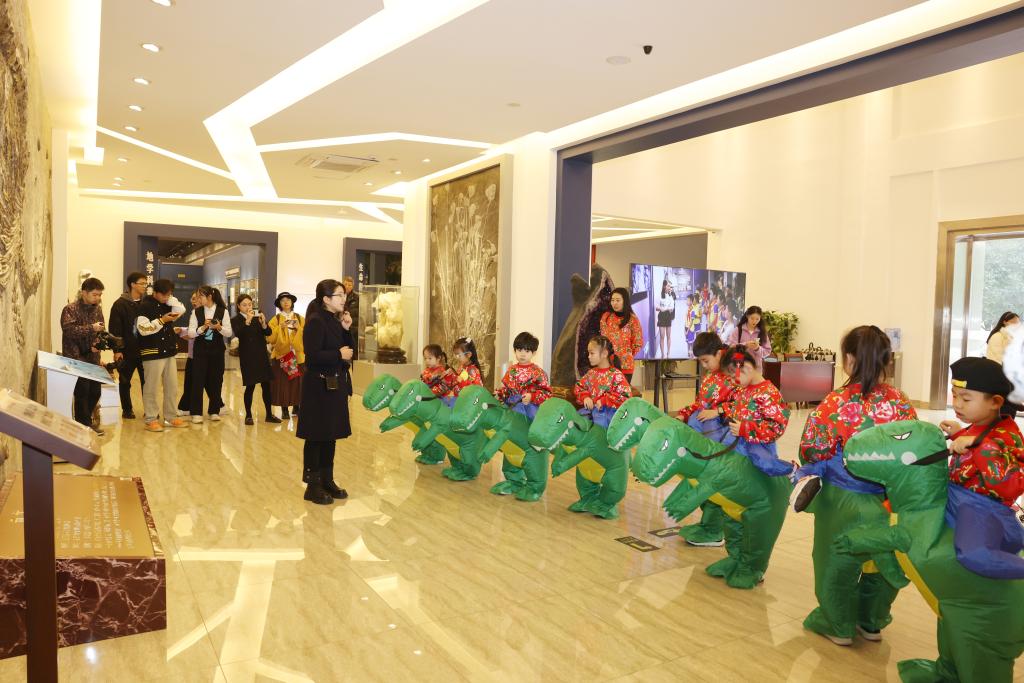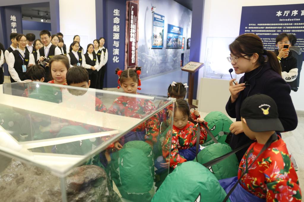 千奇百态的展厅里,古生物化石、矿物、陨石、岩石、矿石和宝玉石等6000余件珍贵标本让小朋友们目不暇接、惊叹不已。全国馆藏最长的13m鱼龙化石、重达650公斤的自然铜标本、来自宇宙重达3.5t的南丹铁陨石、曾经生长在广西长达19米的扶绥龙(模型)、在荧光灯作用下可“发光”的矿物晶体、来自遥远南极的岩石标本、产自广西桂林的鸡血玉、丰富多彩的矿物晶体……不仅让“小冻梨”们走进了博物馆,也走近了地球。