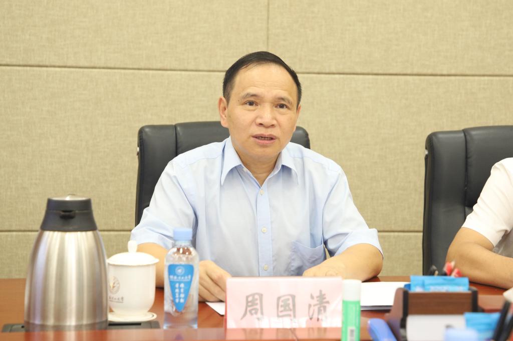 周国清代表学校对唐高华一行的到来表示热烈欢迎,并简要介绍了学校建校历史、学科专业布局、学位点建设等方面的情况。他表示,学校当前正深入学习贯彻党的二十届三中全会精神和习近平总书记关于广西工作论述的重要要求,主动融入国家重大战略和地方经济社会发展大局,聚焦“强院兴校”战略和“九个桂工”建设新愿景,加快推进高水平理工大学建设。他希望,双方以本次交流为契机,立足各自教育资源优势,进一步深化合作交流,促进两校共同发展。