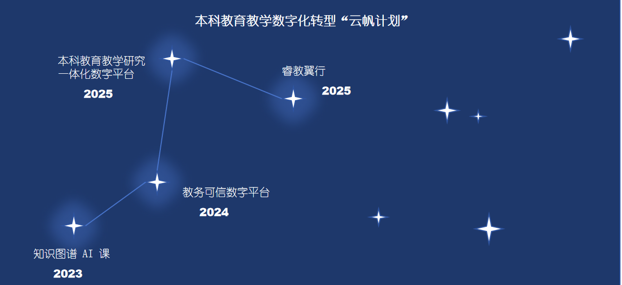未来,本科生院将继续深入推进“云帆计划”的实施,秉持开放包容的理念,勇于探索创新,加强与企业的合作交流,共同推动教育数字化转型的深入开展。根据“云帆计划”规划,本科生院将持续点亮本科教育教学数字化星图,截至目前,“云帆计划”已点亮“知识图谱AI课程”项目、教务可信数字平台项目,2025年将继续点亮“本科教育教学研究一体化数字平台”项目、“睿教翼行”项目等。