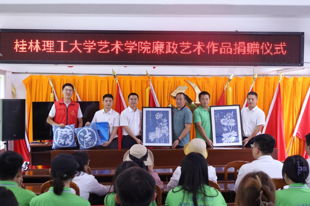 “人生就像素布一样,只有'扎紧'廉洁底线,才能在历经千染万洗后仍葆廉洁底色。"为加强清廉学院建设,将廉洁文化入乡村,活动当天,学院在灌阳镇大源村举行廉洁艺术作品捐赠仪式,由学院师生创作的廉政主题扎染作品、剪纸、背包送到了当地干部群众手中,在现场交流廉洁作品的创作意义,此外学院“探乡里发展镜头映富兴”实践团成员将对接乡村文化发展建设需求绘制文化长廊和墙绘,开展寻找良好家风家训访谈活动,将绿色发展、生态宜居、乡风文明理念植入人心。