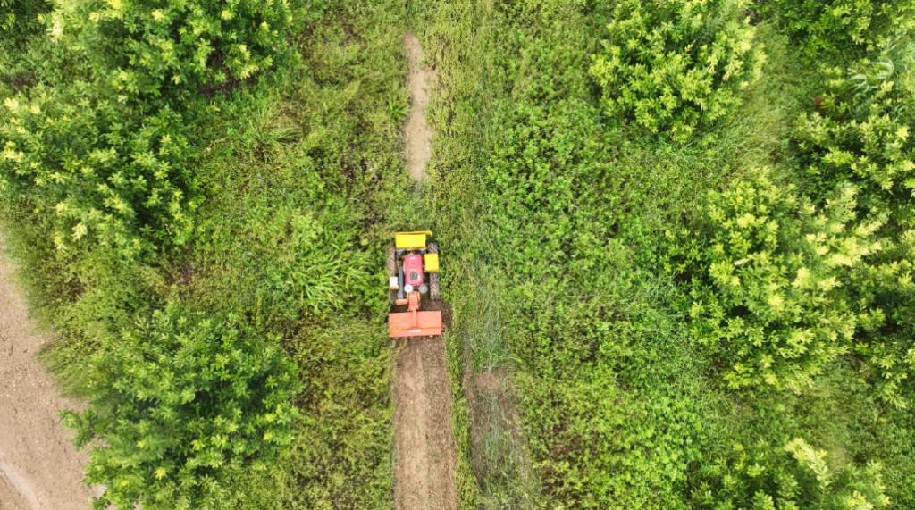 雨后,龙头乡林旺村坚果种植基地一片绿意盎然,一台小巧的微耕机在坚果林间穿梭,刀片快速切断杂草、松解板结土壤。项目负责人覃文海手持遥控器,精准操控着微耕机进行林间作业。