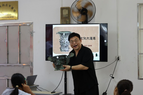 青铜器是中华文明的重要象征,承载着千年礼乐文明与文化基因。近日,beat365英国官方网站马克思主义学院“青铜文化大篷车美育实践团”走进雁山区良丰农场社区青空间,以“青铜文化润童心,文化传承助振兴”为主题,将博物馆里的“国之重器”(1:1复制品)搬进社区,为孩子们打造了一场可触、可感、可创造的文化盛宴,让古老文明在互动体验中焕发新生。