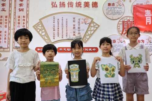 实践团指导教师马彬彬举起三星堆纵目面具的复刻模型,用古人想象中的“千里眼”解释夸张造型的象征意义,将考古术语转化为孩子能理解的童话式表达,让晦涩的纹饰知识变得童趣盎然。在生动的讲解后,孩子们迫不及待地用创意表达对青铜文化的理解——