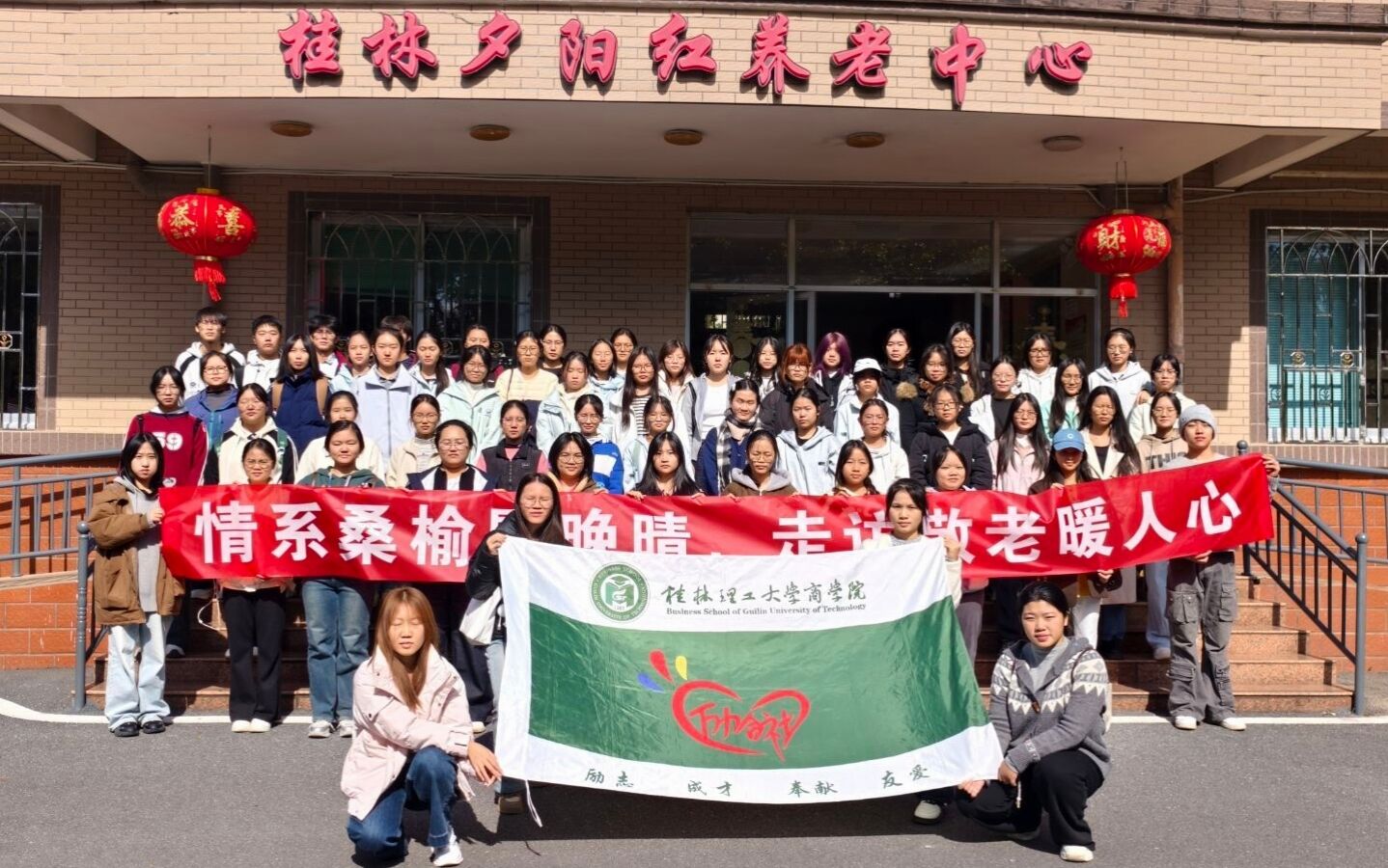近日,beat365英国官方网站商学院组织师生党员与青年团员代表五十余人,前往桂林夕阳红养老院开展“情系桑榆慰晚晴,走访敬老暖人心”主题志愿服务活动。此次活动作为学院深化“三全育人”综合改革、推动党团组织协同育人的重要实践,旨在通过志愿服务传递温暖,引导青年在奉献中坚定理想信念、增强社会责任。
