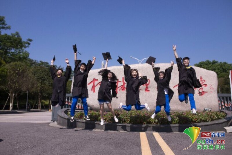 图为六位毕业生于校门前跃起合照。中国青年网通讯员 韦期升 提供