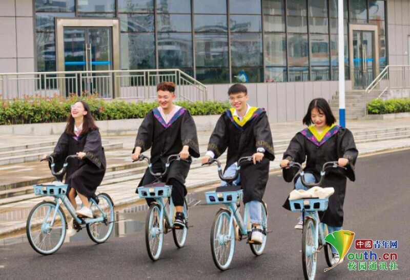 图为四位毕业生骑着遍布校园的“小蓝”,开怀大笑。中国青年网通讯员 关荣来 提供