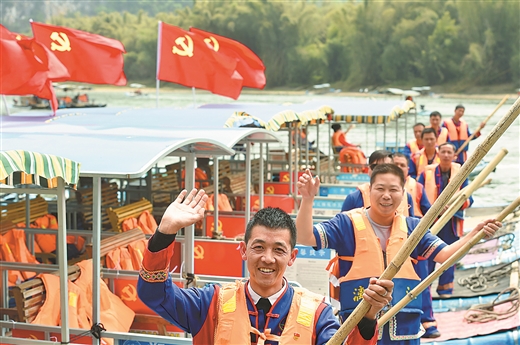 近年来,阳朔县大力打造“秀美漓江党旗红”党建品牌,组建漓江筏工先锋服务队,为游客提供高质量服务。唐艳兰/摄