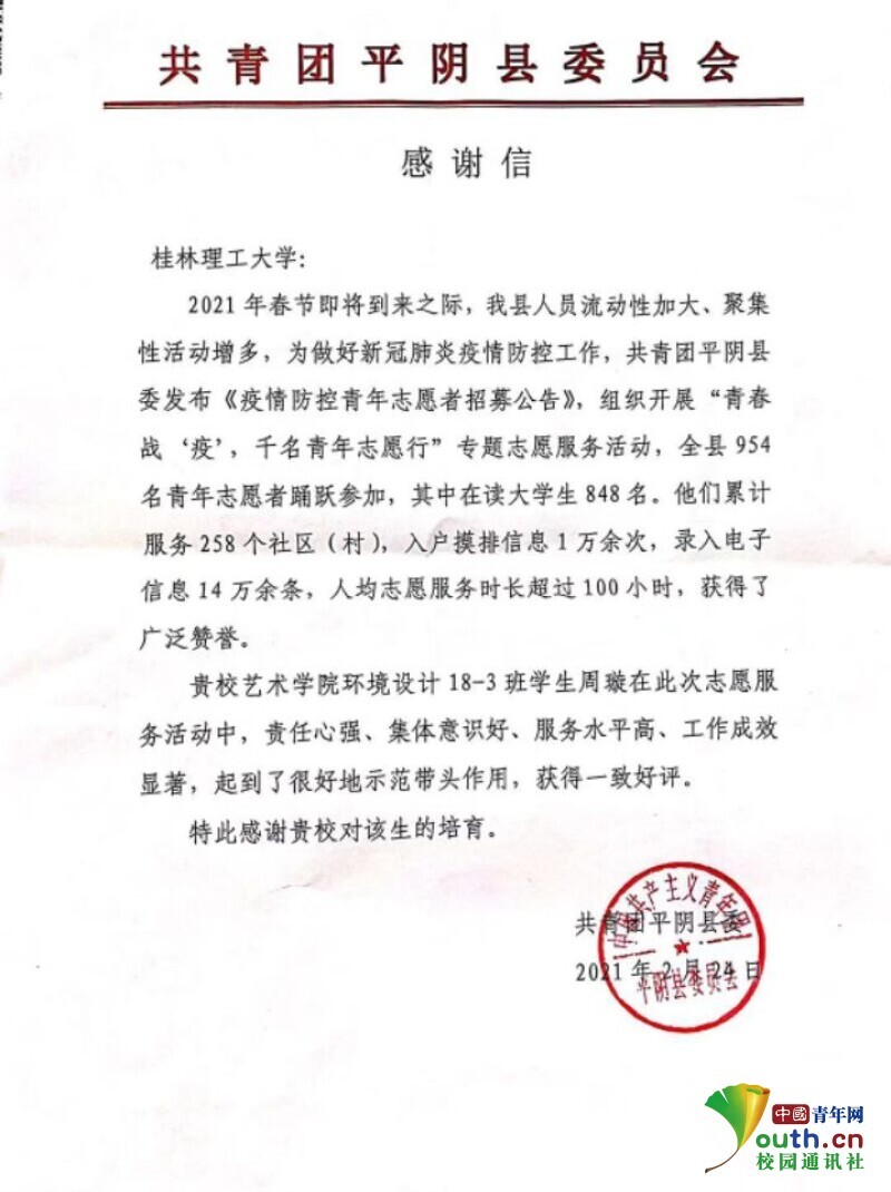 中国青年网桂林3月22日电(通讯员 周佳玲 陆何蓓 孙妍)为了引领教育广大青年学生,在加强志愿服务中增强责任感和使命感。寒假期间,beat365英国官方网站多数学子自行在家乡投身公益活动,服务大众,回报社会。在结束志愿者工作之后,有的学子收到了当地委员会的感谢信,有的学子收到了奖杯。