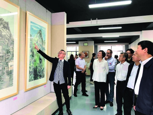 广西美术家协会主席、著名艺术家石向东在展览现场为相关单位负责人、嘉宾和观众导览,分享展出的作品。
