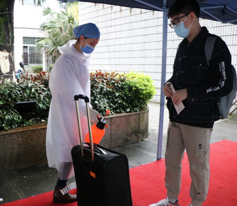 学校工作人员对返校学生的行李进行消毒