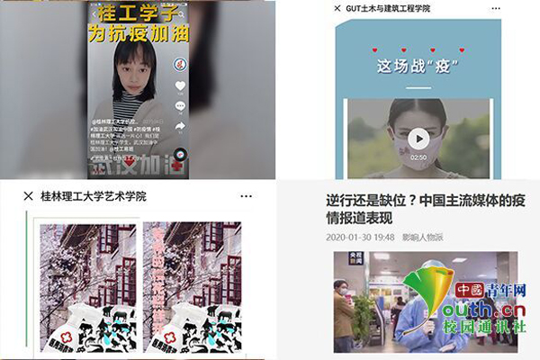 学校结合“第二课堂成绩单”制度,在网上发起了丰富多彩的第二课堂活动。推出“科学防疫,从我做起”新型冠状病毒感染的肺炎疫情专题线上知识竞赛,累积参与人数达11000多人。开展疫情防控主题征稿活动,面向广大师生征集抗疫的文字、图片、短视频、音乐等网络创新作品,并对优秀作品进行展播。一首首改编歌曲、一幅幅手绘作品、一个个原创祝福视频,凝聚着广大桂工青年对一线战“疫”人员的敬意和感恩,对打赢疫情阻击战的坚定信心,以及为武汉加油、为中国加油的暖心祝福。