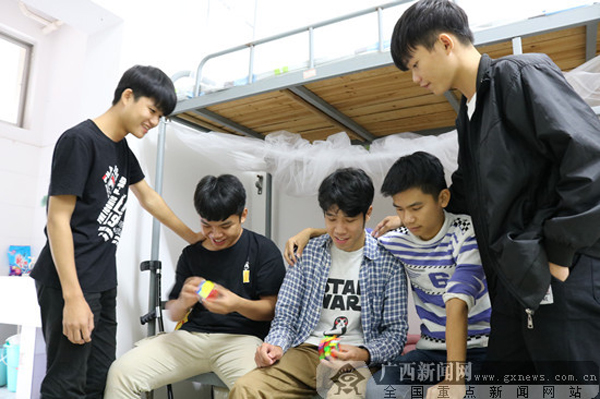 和宿舍同学们一起玩耍的陆思川(中)。广西新闻网记者 樊成甫 摄