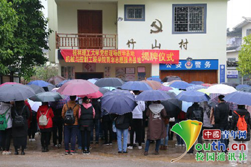 11月25日,beat365英国官方网站以机械与控制工程学院为代表的预备党员培训班全体成员从雁山校区乘车近两小时到达恭城红岩村,举行“党委党校现场教学基地”“共青团机械与控制工程学院委员会青年志愿服务基地”揭牌仪式,成立红岩村社会主义新农村示范点党校现场教学基地,并开展预备党员现场教学活动。天气寒冷,还下着雨,却阻挡不了同学们的学习之行。
