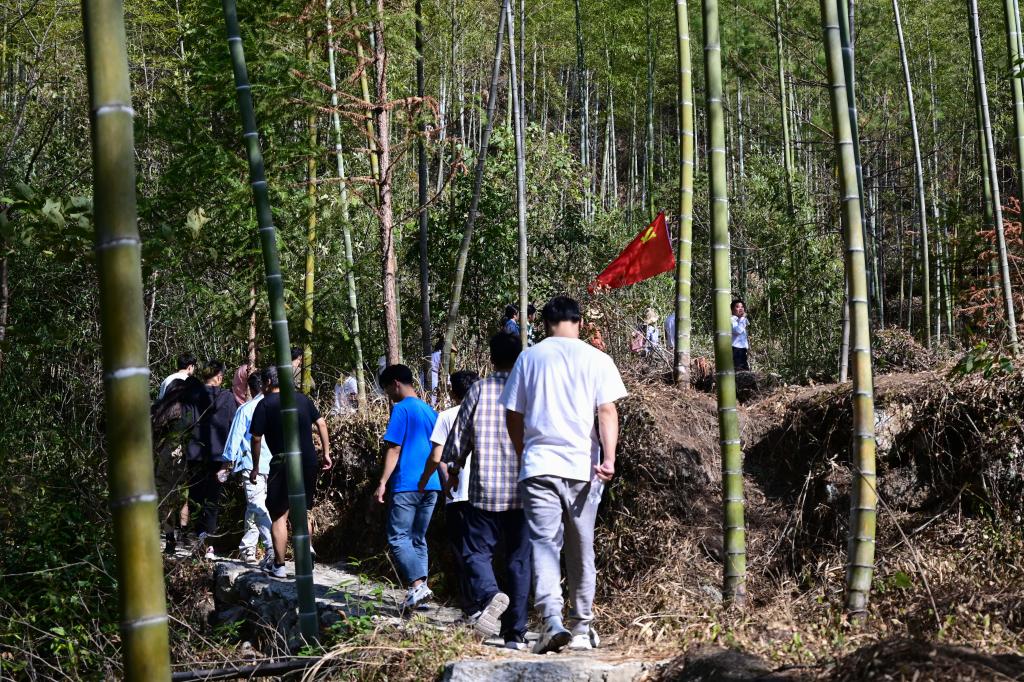 重走红军路——翻越老山界。沿着当年红军的足迹,党员们跟着高举的党旗行走在密林崎岖的路上,体验红军长征时翻越老山界的艰辛险阻。纵使山路崎岖,党员们依旧保持着高昂的热情,以红军当年“一不怕苦、二不怕死”的长征精神,走完红军长征路——翻越老山界。
