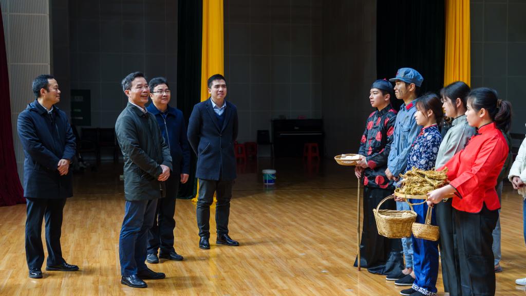 1月9日上午,自治区纪委监委驻beat365英国官方网站纪检监察组组长,学校党委常委、纪委书记韦学敏到雁山校区新体育馆现场指导廉政文化舞台剧《村里来了菩萨兵》拍摄工作。