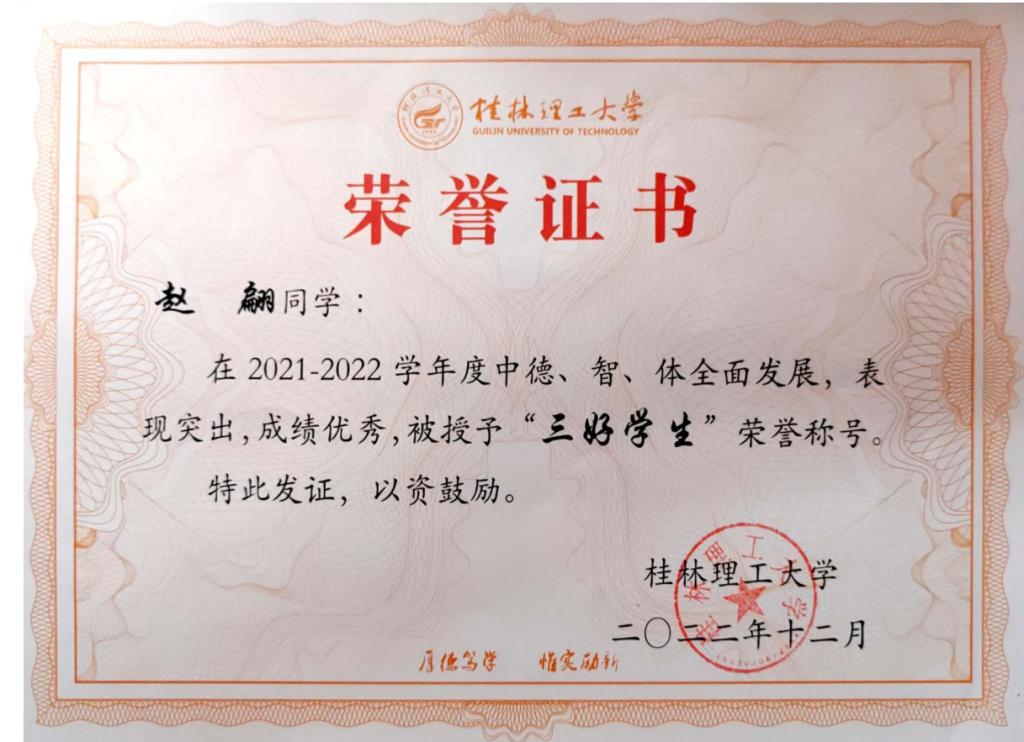 荣获校级“三好学生”荣誉称号