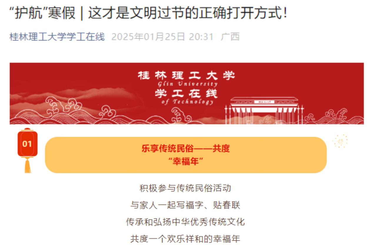 织密防护网,守好责任田。学工部(处)、党委研究生工作部紧扣春节节点,紧贴工作要点,推出《守护假期安全,共度祥和新春》《“护航”寒假》系列安全知识推文,涵盖防诈、防火、文明过节等内容,成为学生“掌中安全指南”。做好延迟离校学生在校期间管理服务工作,实行屏风、雁山两校区24小时专人值班,搭建“钉钉”线上审批系统,实现服务响应“零时差”、安全管理“零事故”。南宁分校严格落实“1+N”24小时值班带班制度,全天候开展校园安全巡查,多次对重点区域进行冬季安全专项检查。国际教育学院建立留学生动态管理工作台账,开展公寓“清零式”安全检查,严格规范宗教活动,让异国学子感受中国式校园安全守护。