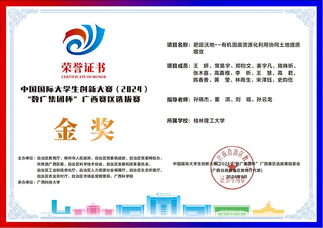2024年,孙晓杰教授项目成果《多源有机固废减污降碳协同与资源化关键技术及应用》荣获2023年度广西科学技术进步奖一等奖,并作为第一指导老师指导学生获得中国国际大学生创新大赛(2024)“数广集团杯”广西赛区选拔赛金奖、第十一届“挑战杯”广西大学生创业计划竞赛金奖。