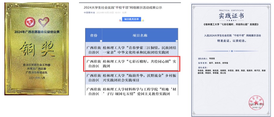 进一步发挥红色教育优势开展党建特色品牌创建,2024年获得广西干部网络学院课程立项1项;学院“薪火湘传”组织员工作室获学校立项;学院舞台剧《村里来了菩萨兵》被自治区推荐参加中纪委有关赛事评选。学院党委、团委全方位指导2024年社会实践工作各环节,通过指派专家党员深入社会实践团队、全流程新闻宣传指导等具体措施,提升了实践育人活动的社会影响力。学院“青春聚力民族团结 星火闪耀卫国戍边”社会实践团队获2024年社会实践团队国家级立项、2024年“三下乡”社会实践“壮美边疆 青春聚力”获批广西专项活动团队、“七彩石榴籽 共绘同心圆”社会实践团队获评2024大学生社会实践“千校千项”网络展示活动实践项目。