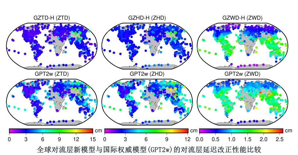 全球对流层新模型与国际权威模型(GPT2w)的对流层延迟改正性能比较