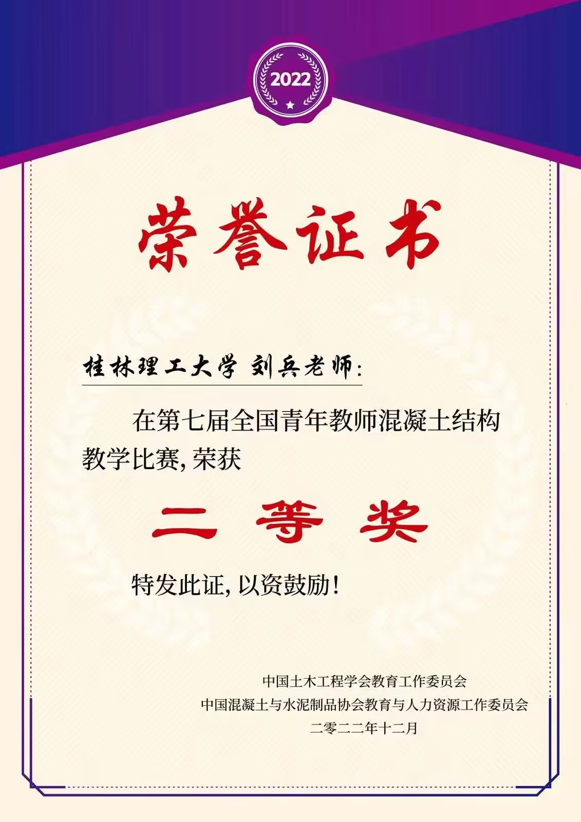 学校教师刘兵在第七届全国青年教师混凝土结构教学比赛中获二等奖