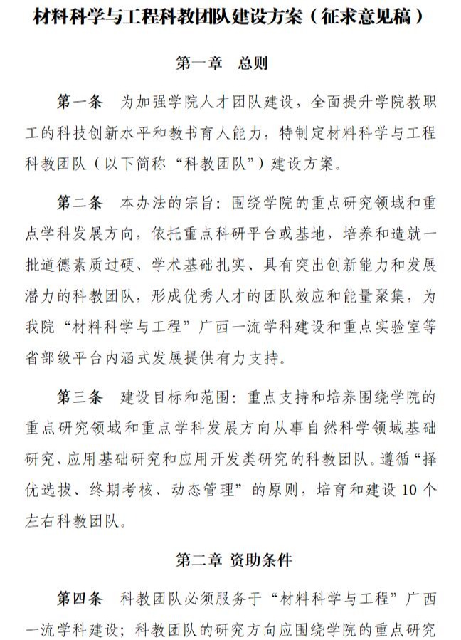 二是按照负责人牵头、成员自愿、学院选拔优化的原则组建团队。学院组织填报《材料科学与工程学院科教团队申请书》,学术委员会认真遴选并对各团队的建设方案提出改进建议,进一步明确遴选的团队“仗往哪里打、谁来指挥、打出什么效果”的问题。组建的11个人才团队的研究方向聚焦在铝、铟等广西有色金属和稀土资源特色上、锚定在光电功能材料和器件应用领域上。