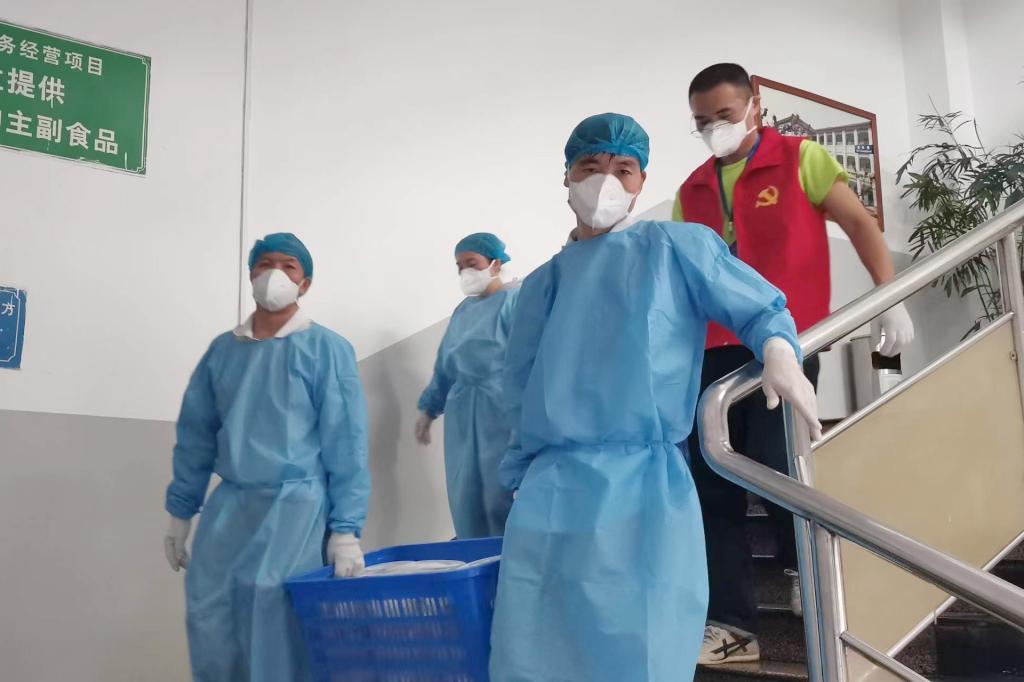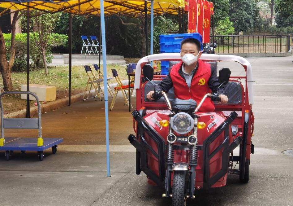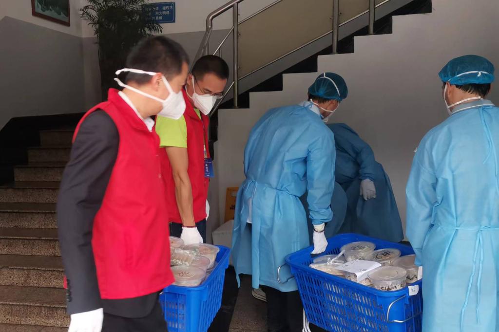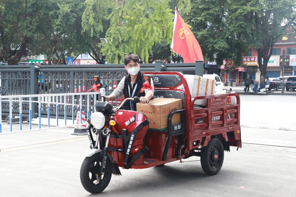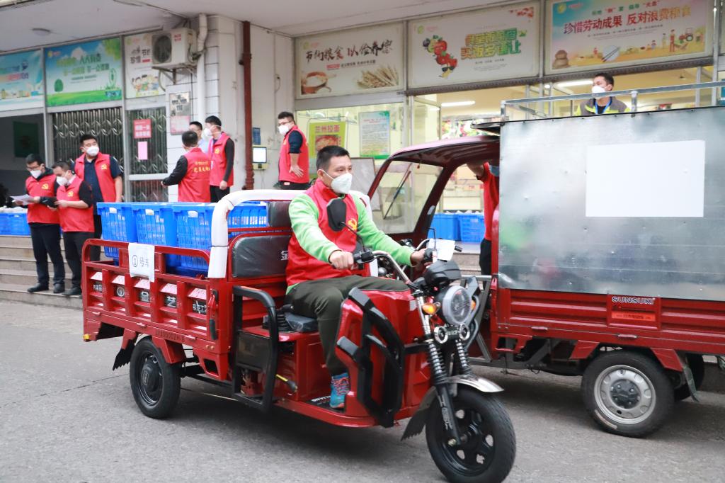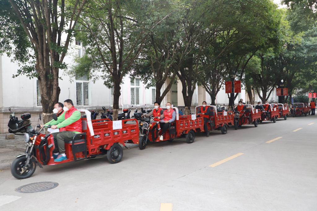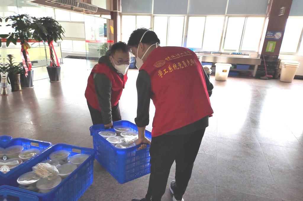 “晚餐打包转运还需要临时加派人手”“今晚物资到学校,请有时间的志愿者晚上22:00到图书馆附楼集合搬运物资”。面对师生日常生活物资、学生宿舍用餐派送需求,一群党员、教师志愿者站了出来,科研人员、教辅人员、专职辅导员、后勤工人等同时化身“红马甲”“红袖章”。从制作到打包,从转运到上楼,近百名志愿者分片包干、任务到人,十几辆电动三轮车穿梭在食堂和宿舍楼之间,承担起了家属社区、学生楼栋物资配送、用餐分发等大量工作,每天一日三餐重复完成装餐、打包、搬运、上楼、分发等动作,组成了校园物资配送的一道特殊流水线,每天高效完成7000余名师生“无接触”配送上门任务。
