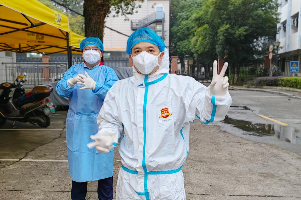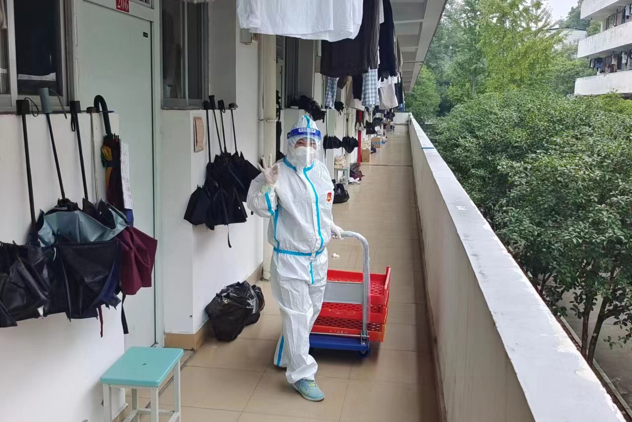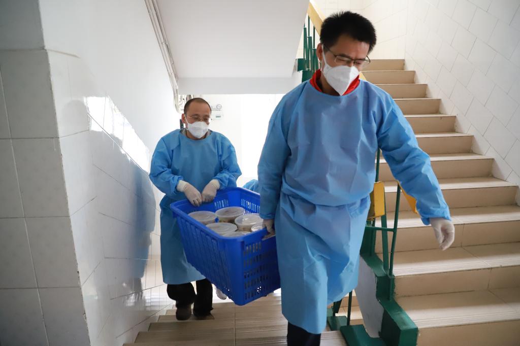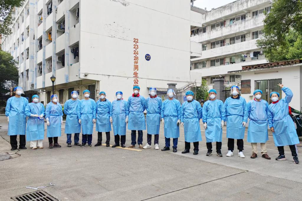 在家属社区值守的志愿者,主动从微信群、QQ群等平台收集居民和学生的需求和心声,帮助解决急难愁盼问题,摸排独居老人、重症患者等人员信息,积极协助医护人员为各个楼栋不方便出门的居民进行入户核酸采样,尽管穿着防护服显得格外臃肿,防护面屏上的雾气已经结成了一颗颗小水珠,但志愿者始终坚持在六层高的楼栋爬上爬下,志愿者的微信运动步数每天都接近2万步。面对部分居民的不理解,志愿者坚持多动嘴,反复向群众解读宣传,利用宣传横幅、流动宣传小喇叭等方式,加强宣传防疫知识、政策,全面营造群防群控的浓厚氛围。对于一些有急需物品需求的师生,志愿者坚持多跑腿,积极帮助居民买药品、修水管、更换氧气罐,最大限度减少疫情给师生群众生活带来的影响。