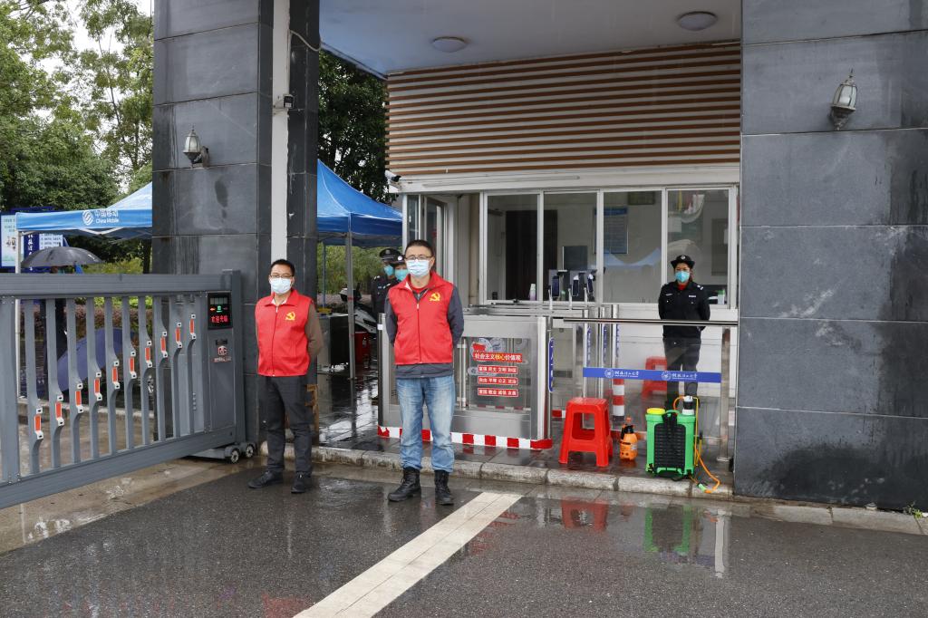 雁山校区志愿者和保卫人员共同守护校园入口关