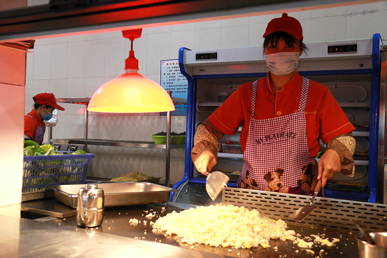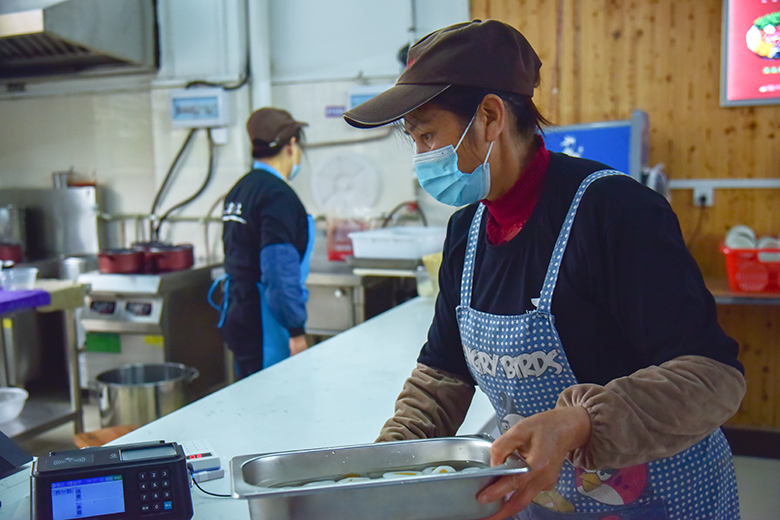 从拣菜、洗菜、配菜、烧菜,到擦拭餐具、清洗地板、做好消杀,她们有条不紊默契配合着;无论寒暑,始终日复一日披星戴月忙碌着,只为让师生们吃得放心、吃得开心。