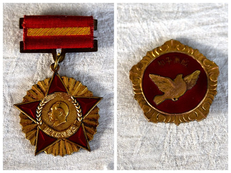 王瑛老师的抗美援朝纪念章以及华北解放纪念章、解放华中南纪念章、解放东北纪念章