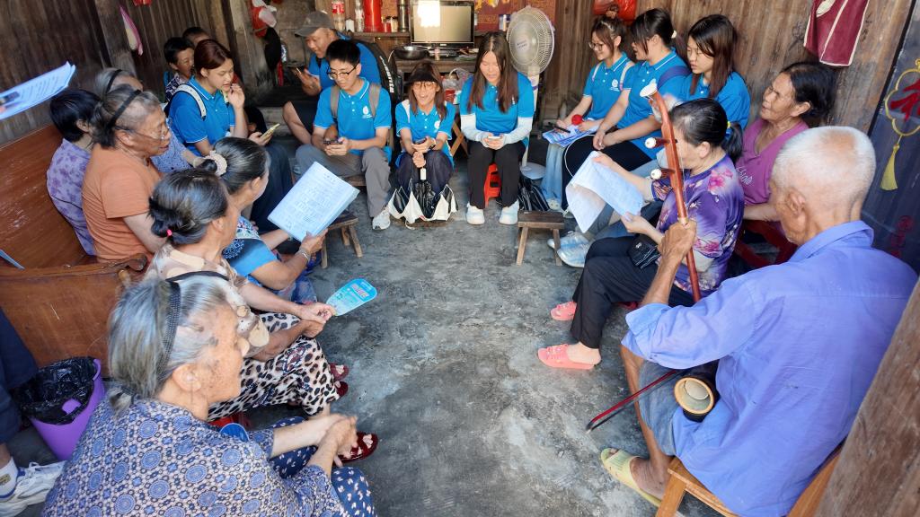 团队成员与村中老人围坐共同奏唱红色歌曲