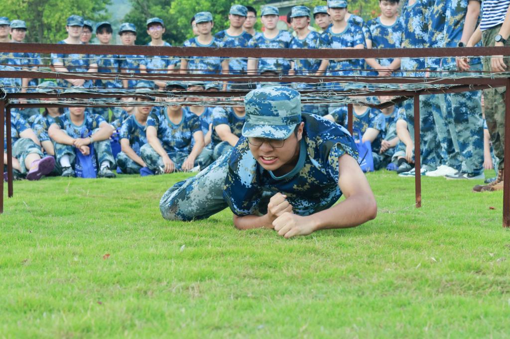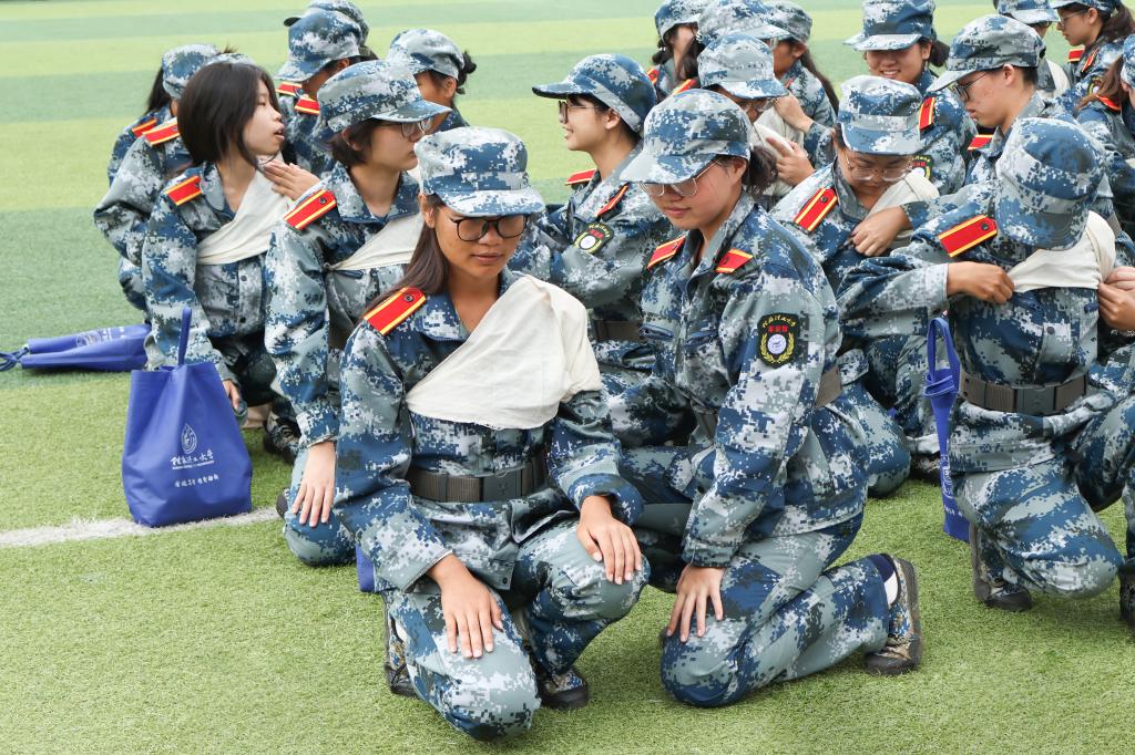 军训涵盖多项实战化训练内容。在“战术训练”中,学生掌握卧倒、起立、匍匐前进等单兵战术动作;“防卫技能与战时防护训练”包括格斗基础、战场医疗救护、核生化防护等,提升学生应急处置与自我保护能力;“轻武器射击”通过激光模拟枪开展据枪、瞄准、击发训练,增强国防实操技能;电磁频谱监测、识图用图等现代化军事课程也穿插进行,拓宽学生视野。