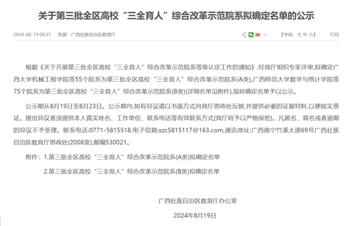 学院获批第三批全区高校“三全育人”综合改革示范院系(A类)