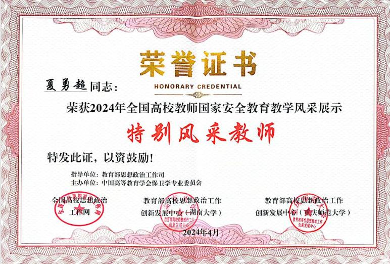 学院教师获2024年全国高校教师国家安全教育教学风采展示“特别风采教师”荣誉称号