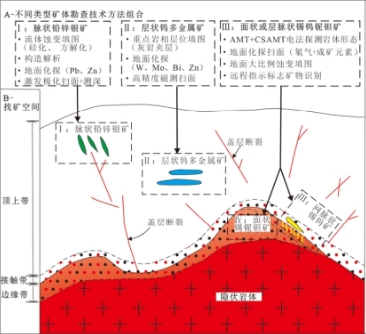 广西隐伏花岗岩区主要成矿类型深部找矿技术方法集成模式图