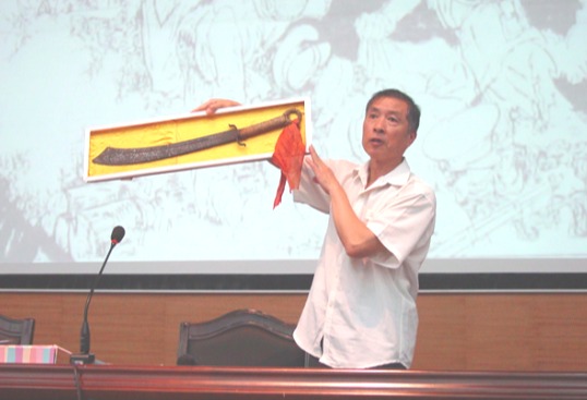 周述忠在桂林师范学院讲《桂林革命故事》时展示他收藏的革命文物