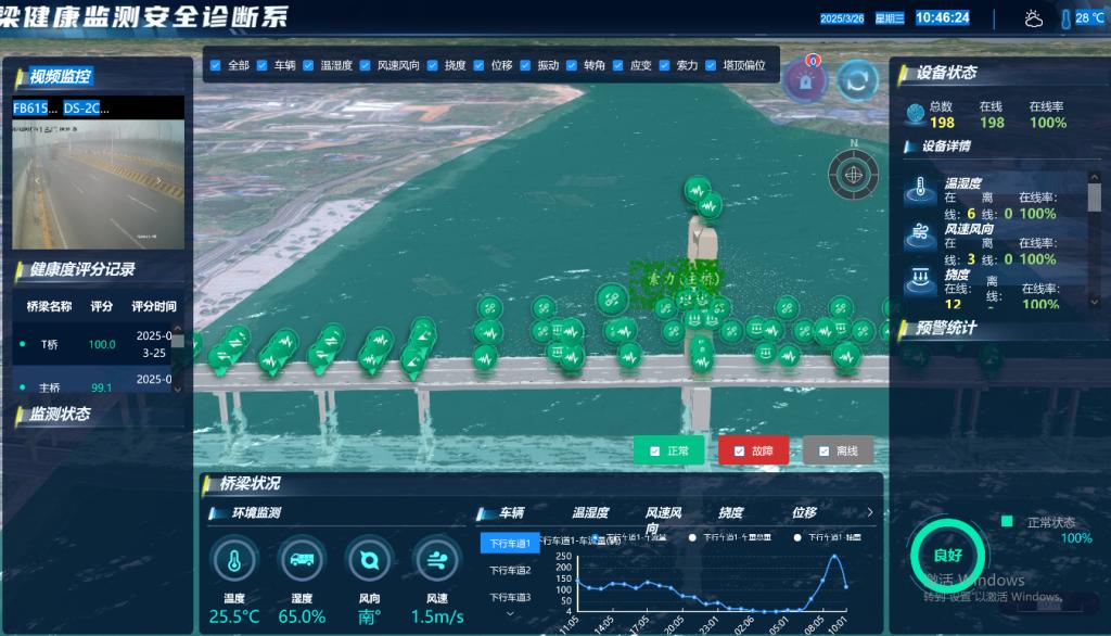 “桥梁健康监测系统”通过对桥梁结构的无损检测、实时监控结构的整体行为,对结构的损伤位置和损伤程度进行诊断,对桥梁的服役情况、可靠性、耐久性和承载能力进行智能评估。系统监测应力应变、静态振动、变形位移、扰度及环境监测等参数,为桥梁的维修养护与管理决策提供科学依据和指导。