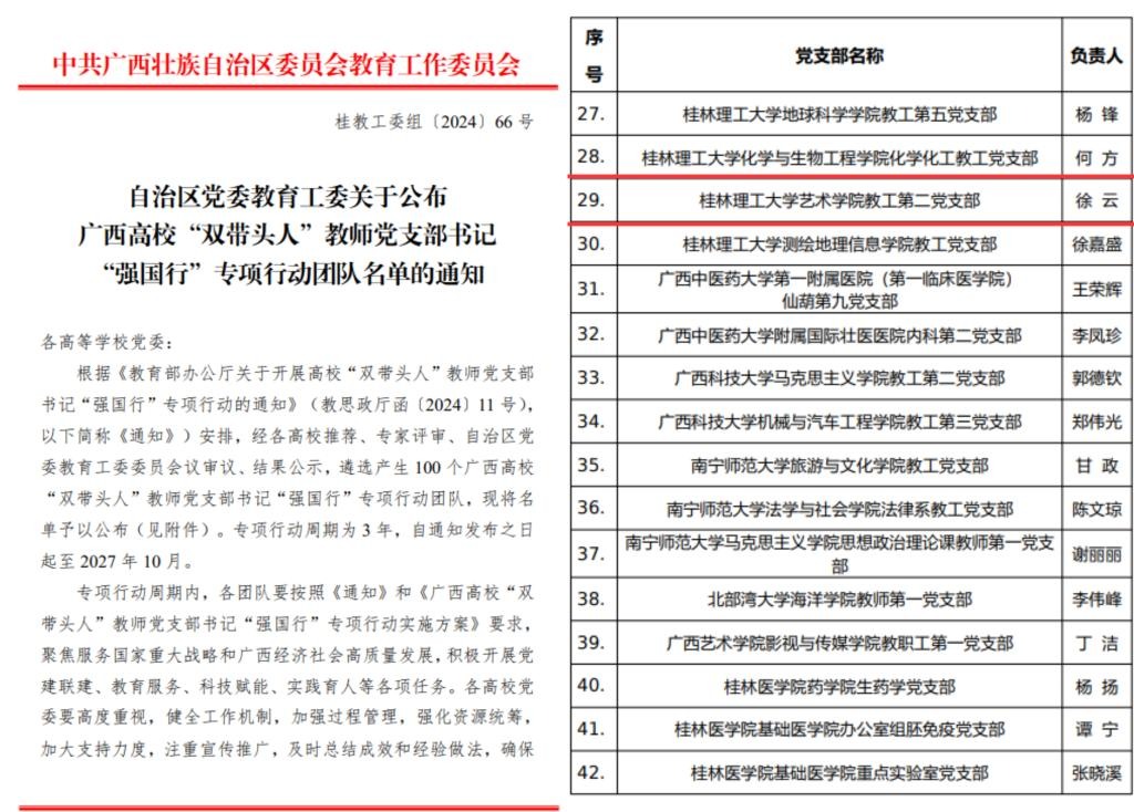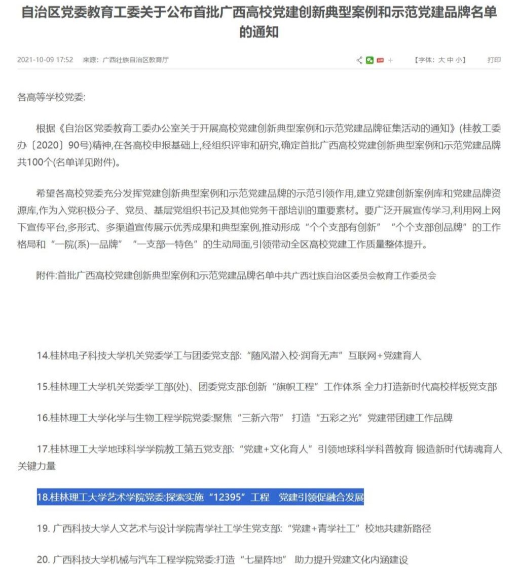 一是建强基层党组织战斗堡垒。扎实推进“五基三化”系列行动,切实增强基层党组织政治功能、组织功能;推行“艺院先锋”示范,党员队伍干事创业更有作为,“一融双高”战斗堡垒更加坚强,学院党组织获批首批广西高校示范党建品牌和全区“强国行”团队。二是强化党建与业务有机融合。引导党支部与教研室工作耦合联动,指导党支部协同教研室承办全国数媒年会、全区轻工业产教对接会等,奔赴深圳、南宁等地深化产教合作,推动重点工作出新出彩,党建与业务融合机制更加完善。三是以高质量党建引领事业高质量发展。通过建强堡垒打硬仗,抓好党建带发展,推动事业实现新突破:学院获批为中国工艺美术大师传承创新基地、广西文化和旅游研究基地,并先后在省部级人才、国家级一流课程、全国高校教师教学创新大赛奖项等方面实现零的突破;国家级科研项目、入选全国美展作品数量大幅增长,年度科研经费规模扩大6倍,设计学软科排名提升88个位次、进入全国前35%、跃居广西榜首。